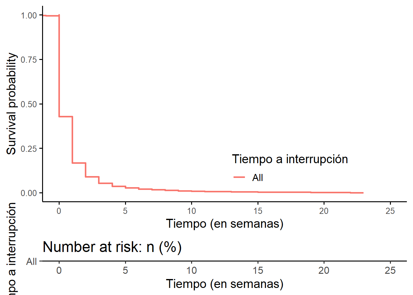 reset_time<- survfit(Surv(HITO3_SEMANAS_G_EVACUA- HITO1_EDAD_GESTACIONAL_SEMANAS, data2$HITO2_DECISION_MUJER_IVE== "INTERRUMPIR EL EMBARAZO") ~1, data=data2, type = "kaplan-meier", error = "greenwood", conf.type = "log-log")